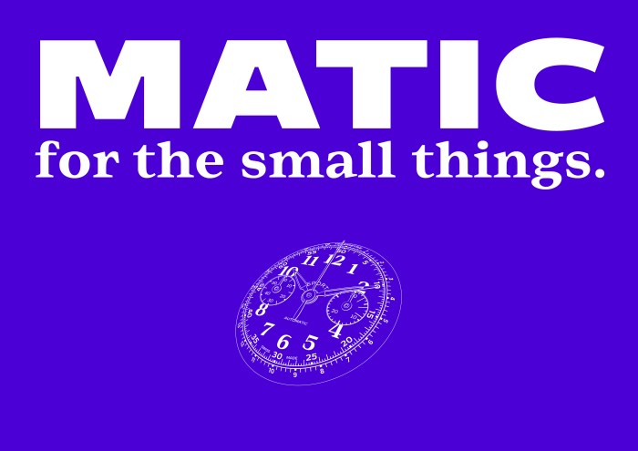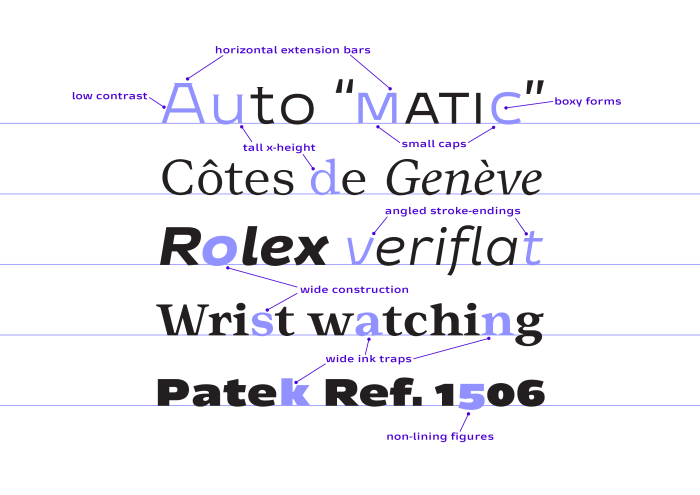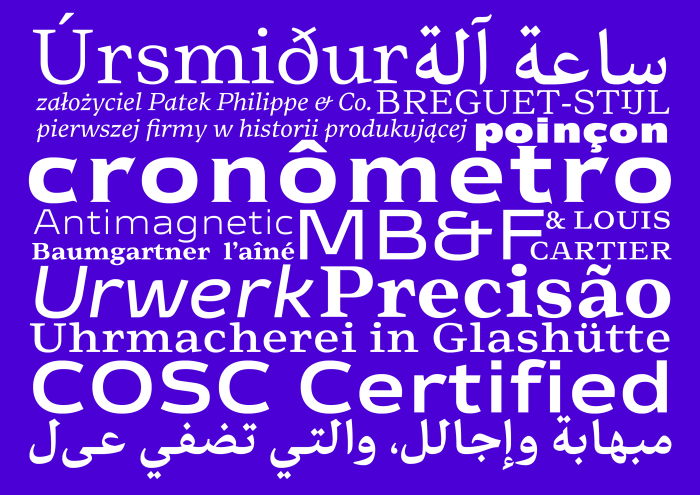 Matic is a multi-script type family that finds its inspiration in the typography of vintage wrist watches. The family is made up of two styles: Matic A uses wide, boxy letterforms with a low contrast and tall x-height. Matic B tones down both the width and the boxiness of its sans-serif partner, but only marginally. Both styles include a set of upright optical weights for extra small settings as well as accompanying italics. A version of Matic A appears in Gerard Unger’s book Theory of type design.