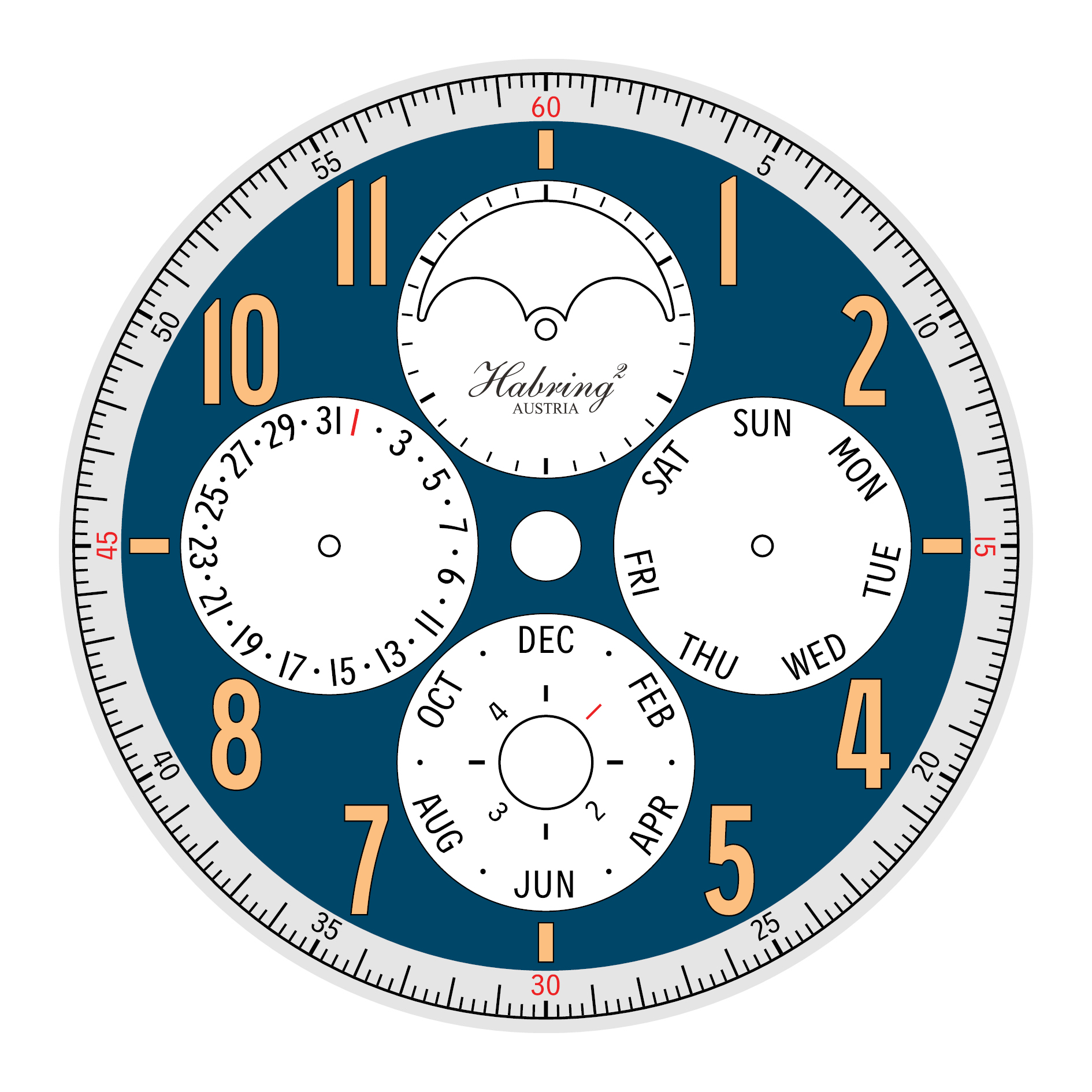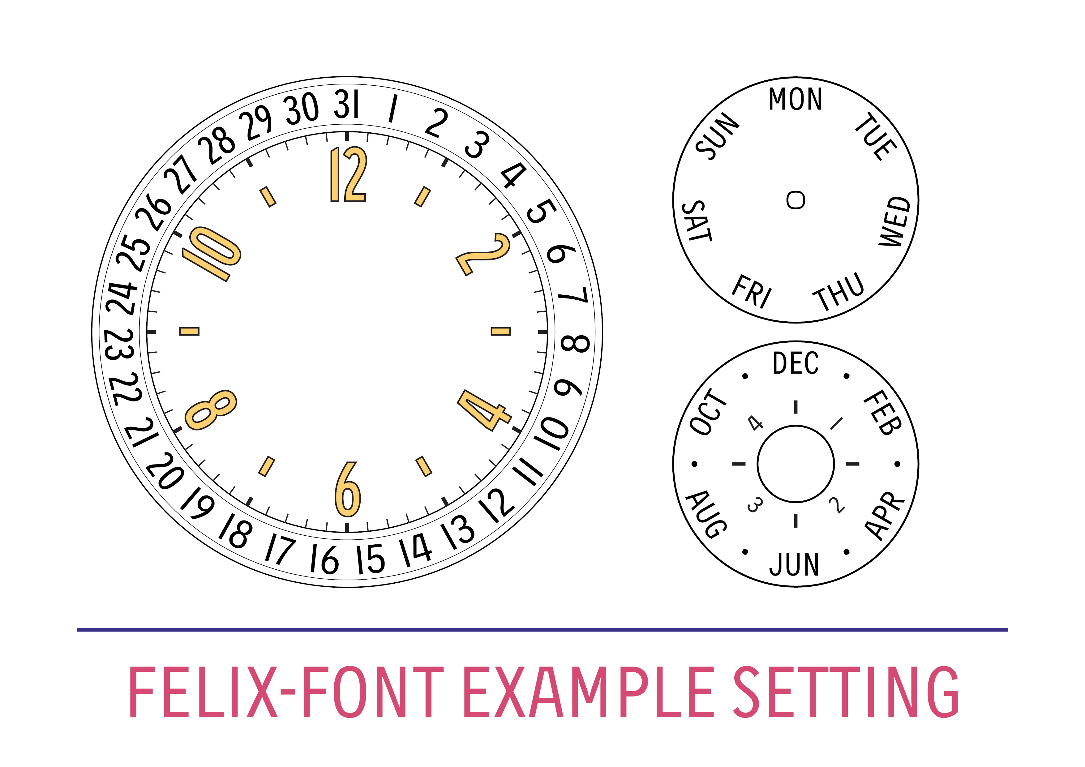 The next step was to create a set of semi-condensed and regular width numerals that could be used for date displays and sub-dials. The two widths were necessary to set a radial date display (see final image) so that the numerals from 20–31 could fit without being squished. Additionally a set of uppercase letters was created so that all dial indications could be laid out using Felix-Font. Applications include chronograph scales such as a tachymeter, telemeter, or pulsometer as well as calendar displays for months and days. The letters are semi-condensed and reference vintage watch typography, making use of a ‘flat-top A’ as well as optically monolinear construction and similar character widths. Wide fitting and ink traps are included to allow for cleaner printing at the small sizes found on watch dials. The goal with Felix-Font was to give Habring² a custom-made typeface that could replace their older fonts. The family needed to retain a neutral quality found in the rest of the Habring² timepieces, as well as reference mid-20th century horological typography.