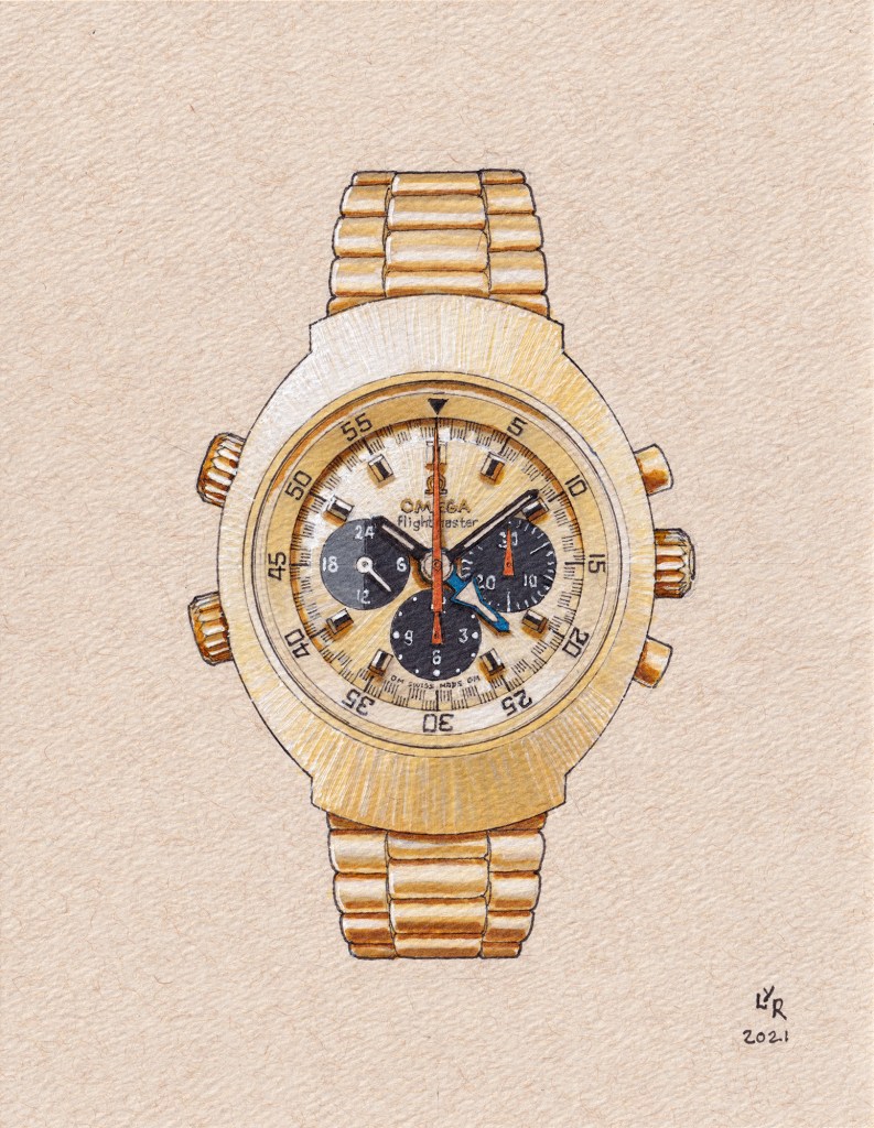The Omega Flightmaster is a crazy watch, and the full gold version goes straight into stratospheric-bonkers levels. Though this drawing wasn’t made to tease or promote a launch, it sits among the year’s highlights since it was simply so fun to draw the watch in all of its brutalist opulence. The Flighmaster also tugs at the same heartstrings as one of my all-time favourite watches, the Speedmaster Mk III.