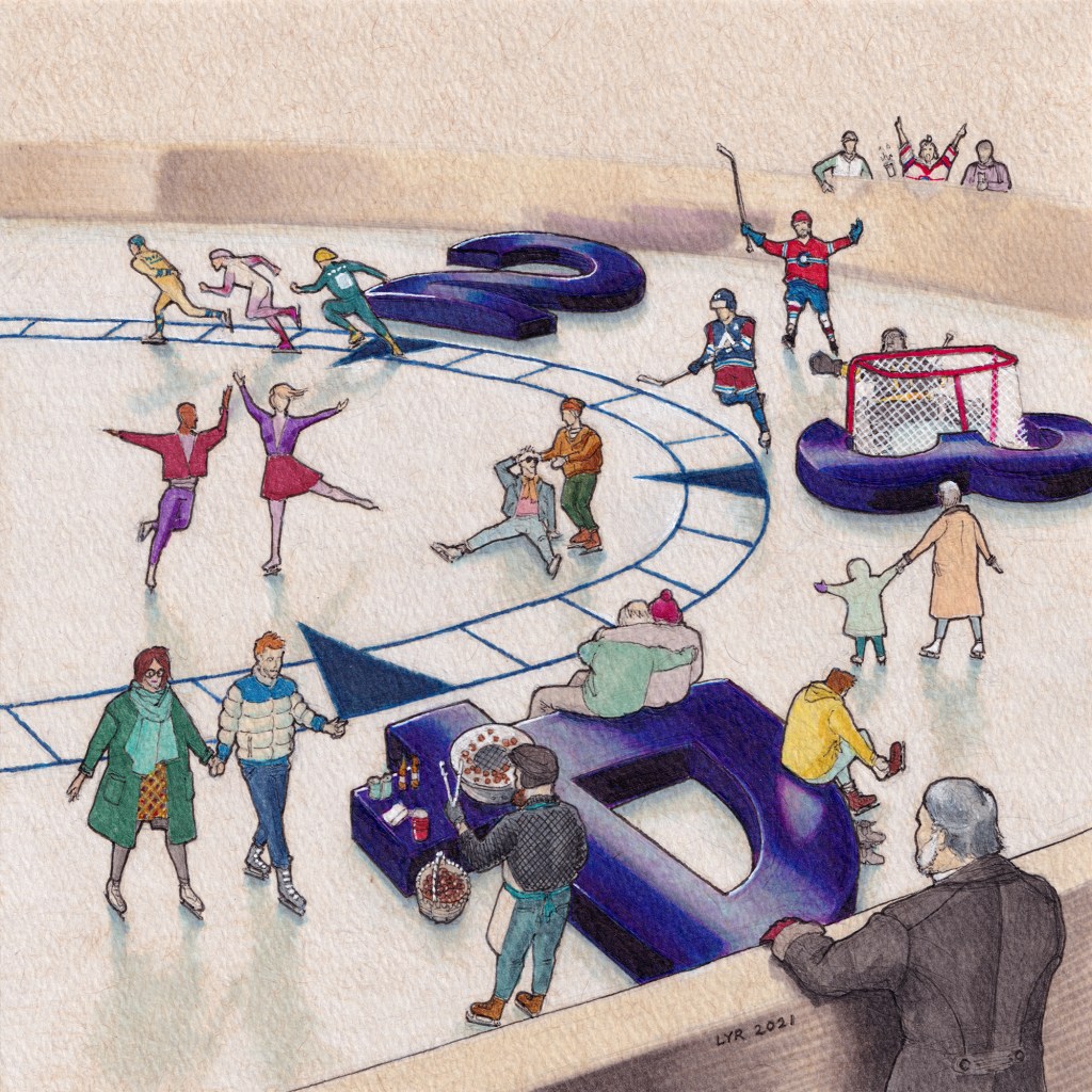 The Charles Frodsham Double Impulse Chronometer is an infinitely fascinating watch. I have been lucky enough to see (and hold!) a Double Impulse Chronometer and one of the first things that struck me was the ice-like quality of the ceramic dial. This is no ordinary white dial, while it and the rest of the watch both feel extremely robust, the dial also has an almost ethereal quality. As a hockey-loving Canadian, the closest thing I could relate it to is the surface of a polished ice rink. This quality inspired the concept for Frodsham’s 2021 holiday card illustration. I included quite a few different skating activities to encourage some joy at the end of a turbulent year.
