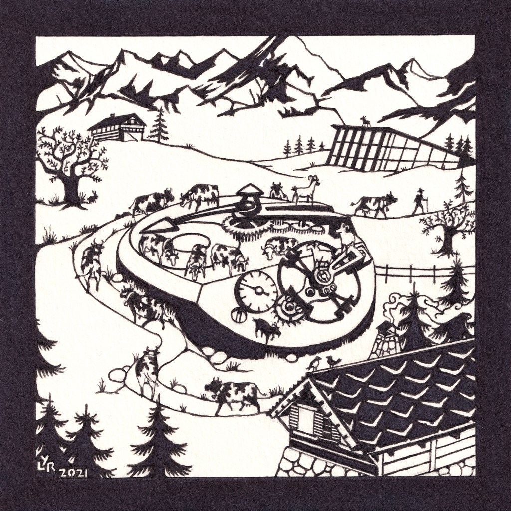 This drawing is a sequel of sorts to last year’s Greubel Forsey Signature 1 poya illustration. This time it is the new Balancier S² that plays host to a herd of cattle being moved about in the alpine countryside. Like the previous poya illustration, this drawing could be cut from black paper to show the same image.
